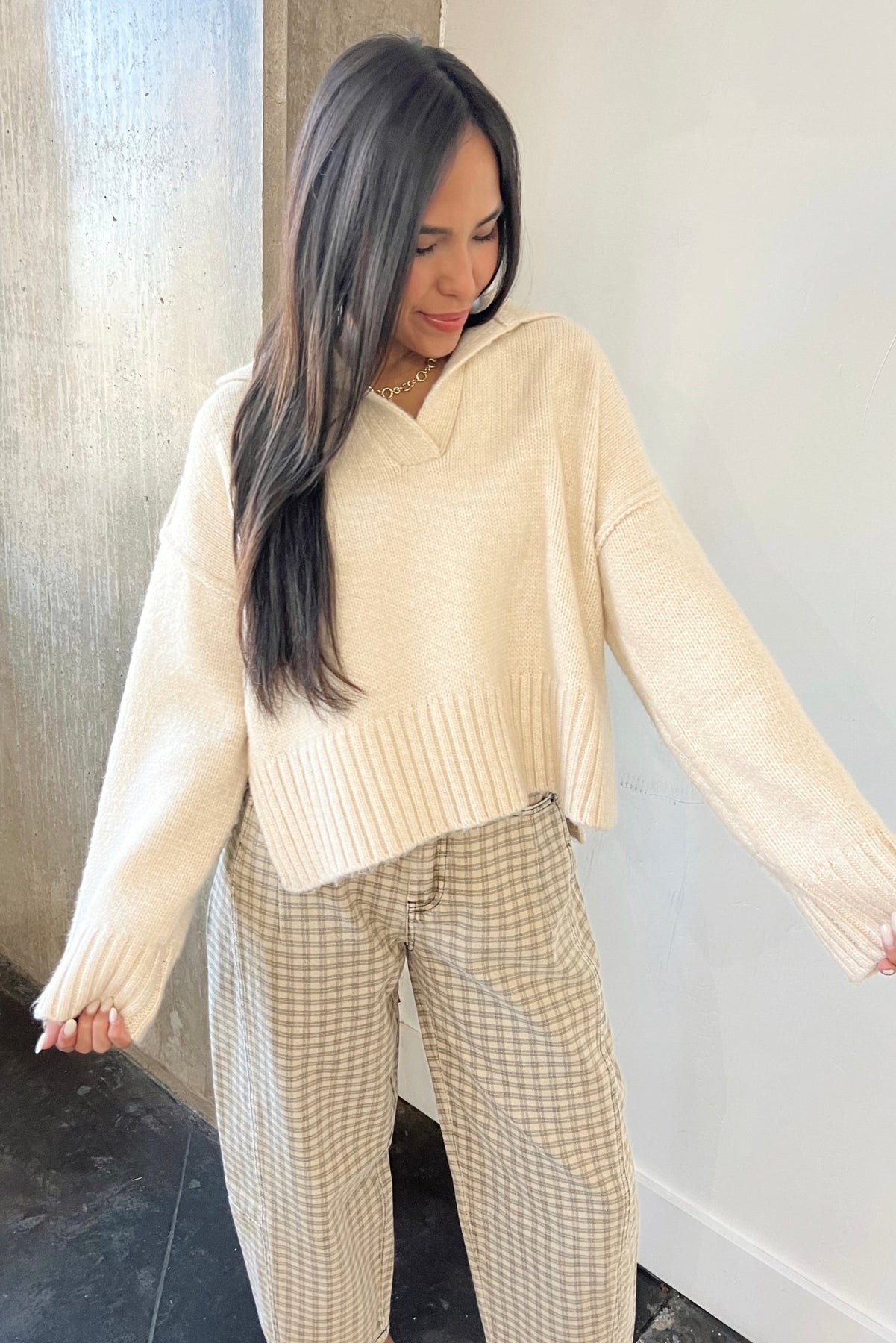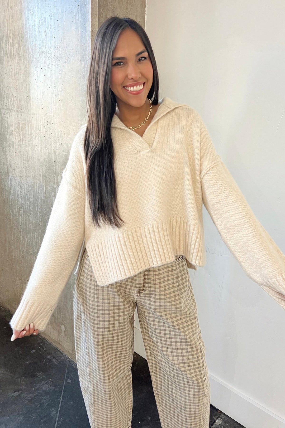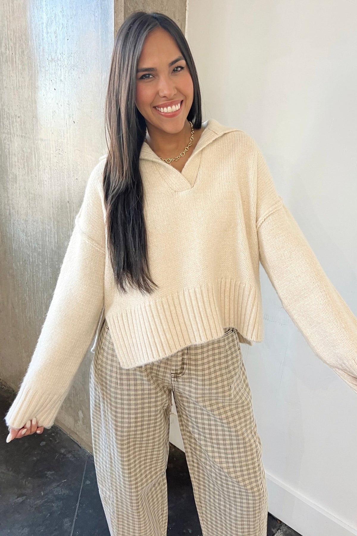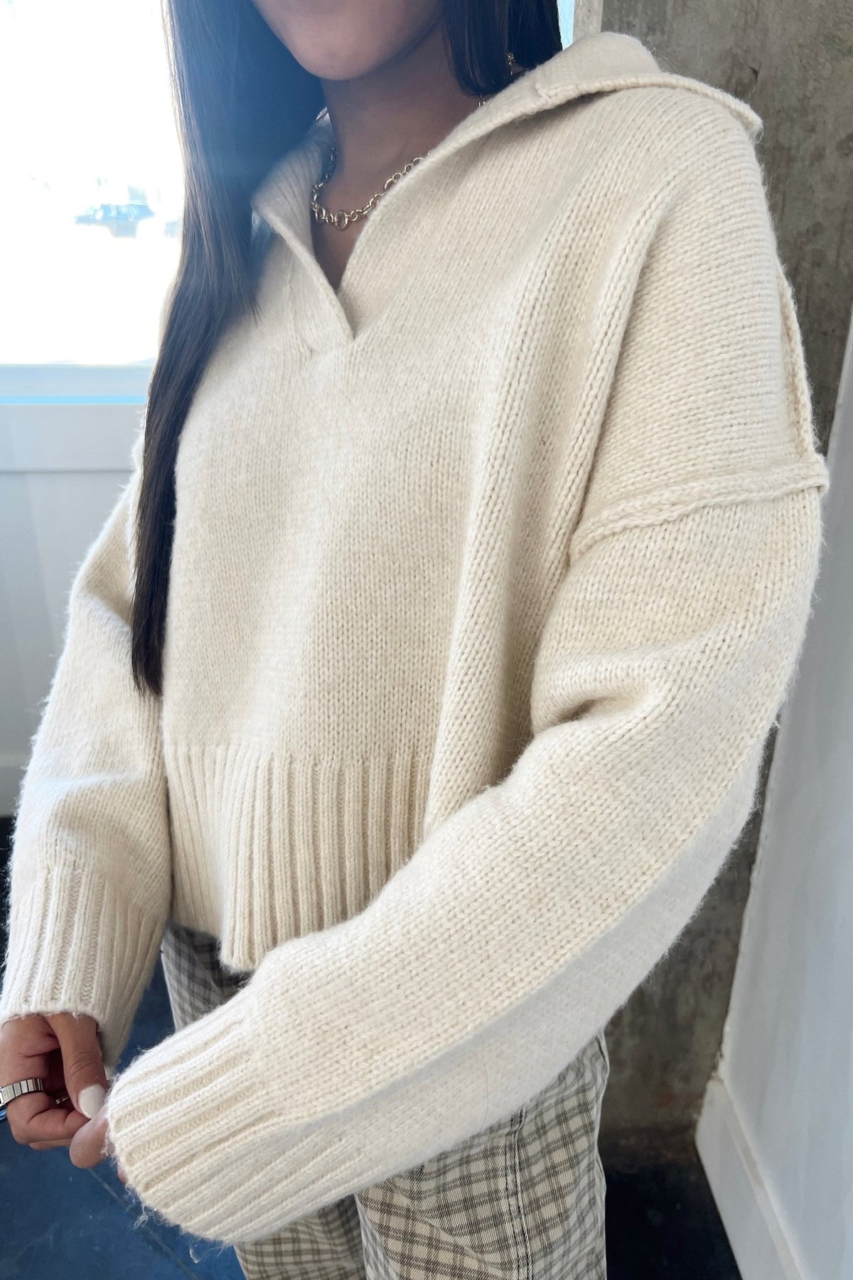 A laid-back knit sweater with a subtle collar and relaxed fit. Comfortable, casual, and elevated.