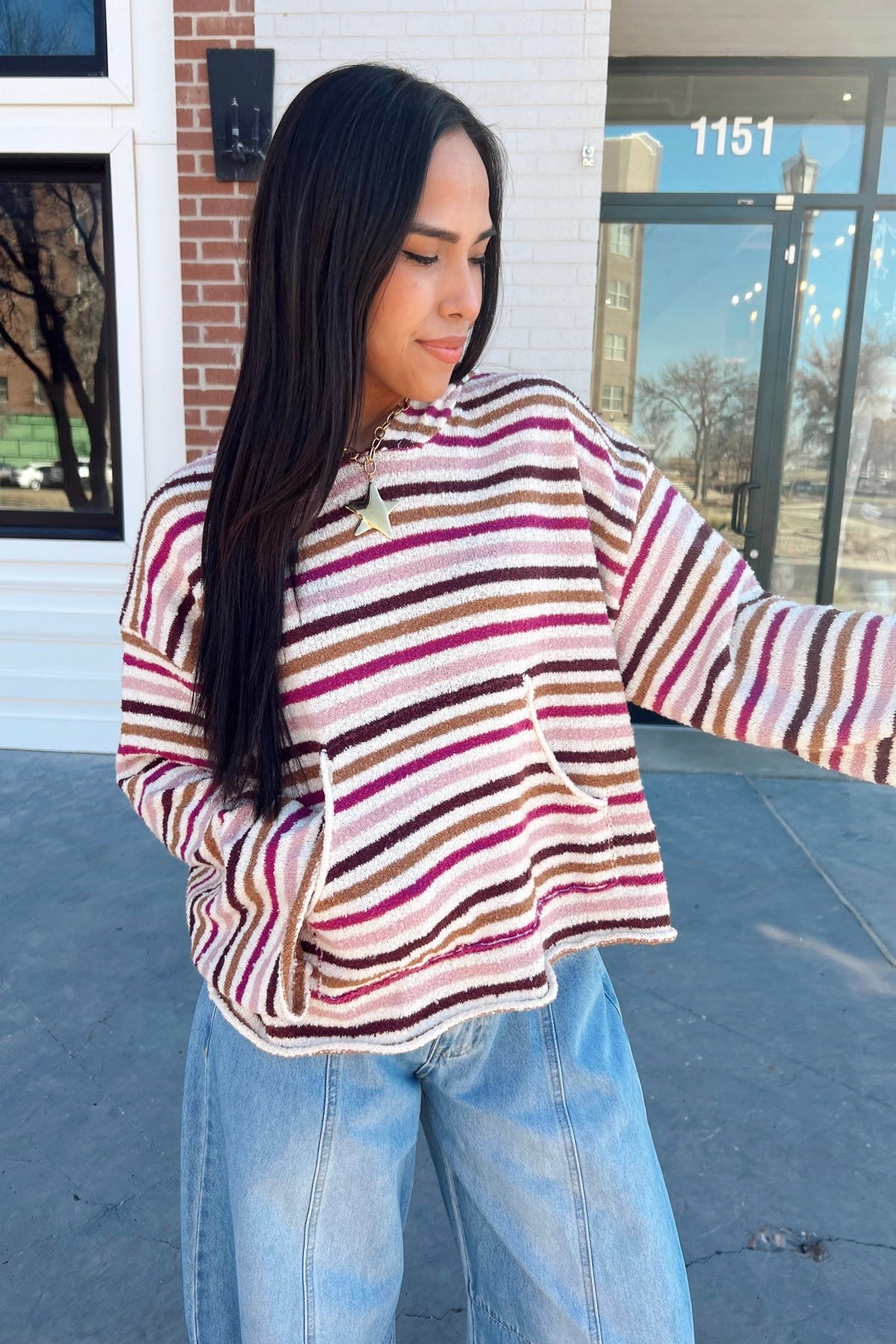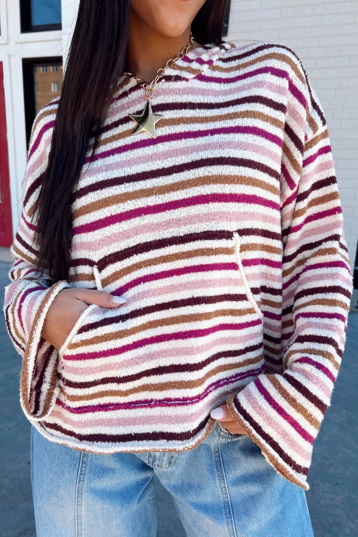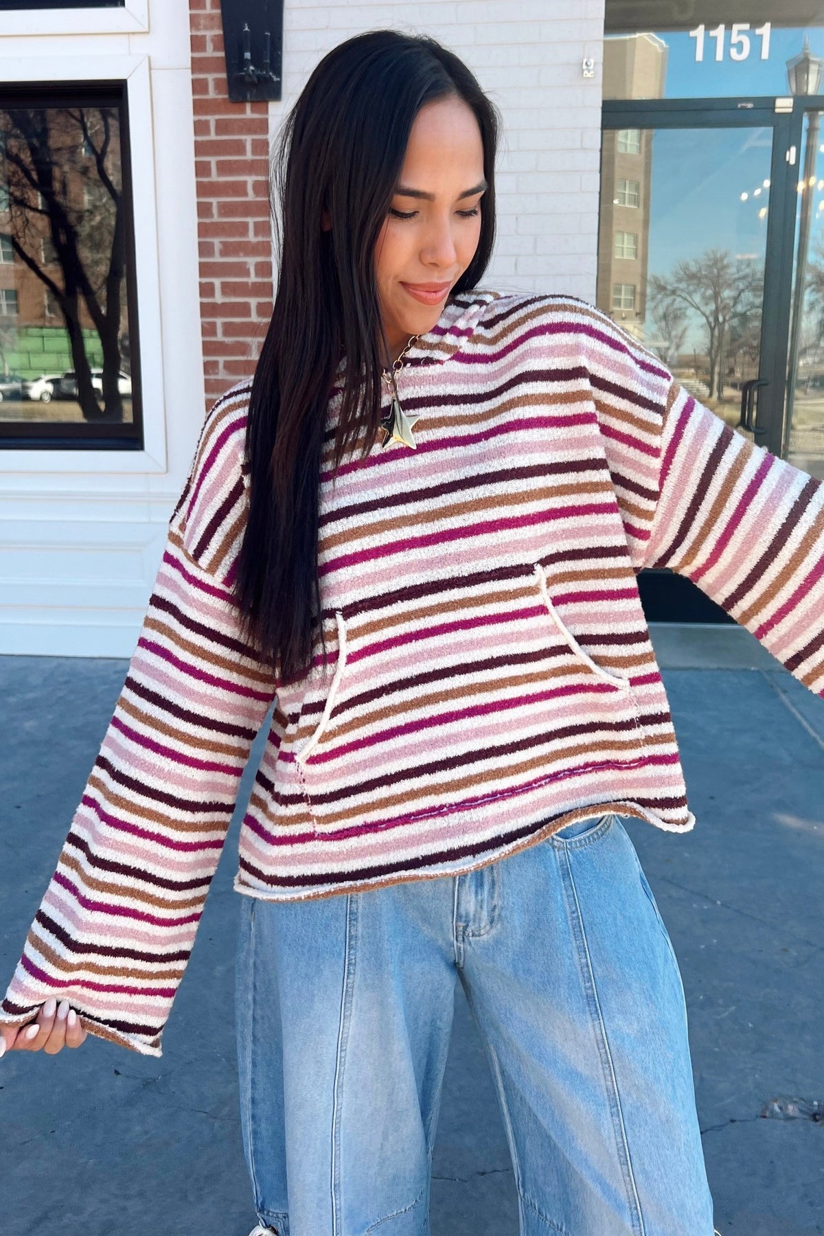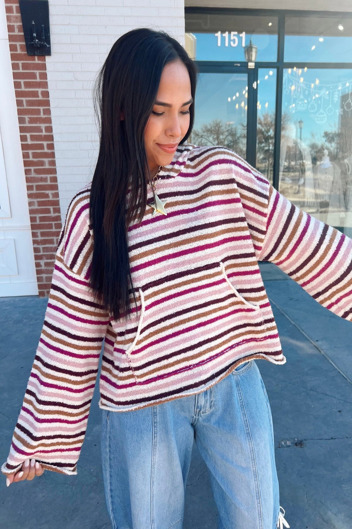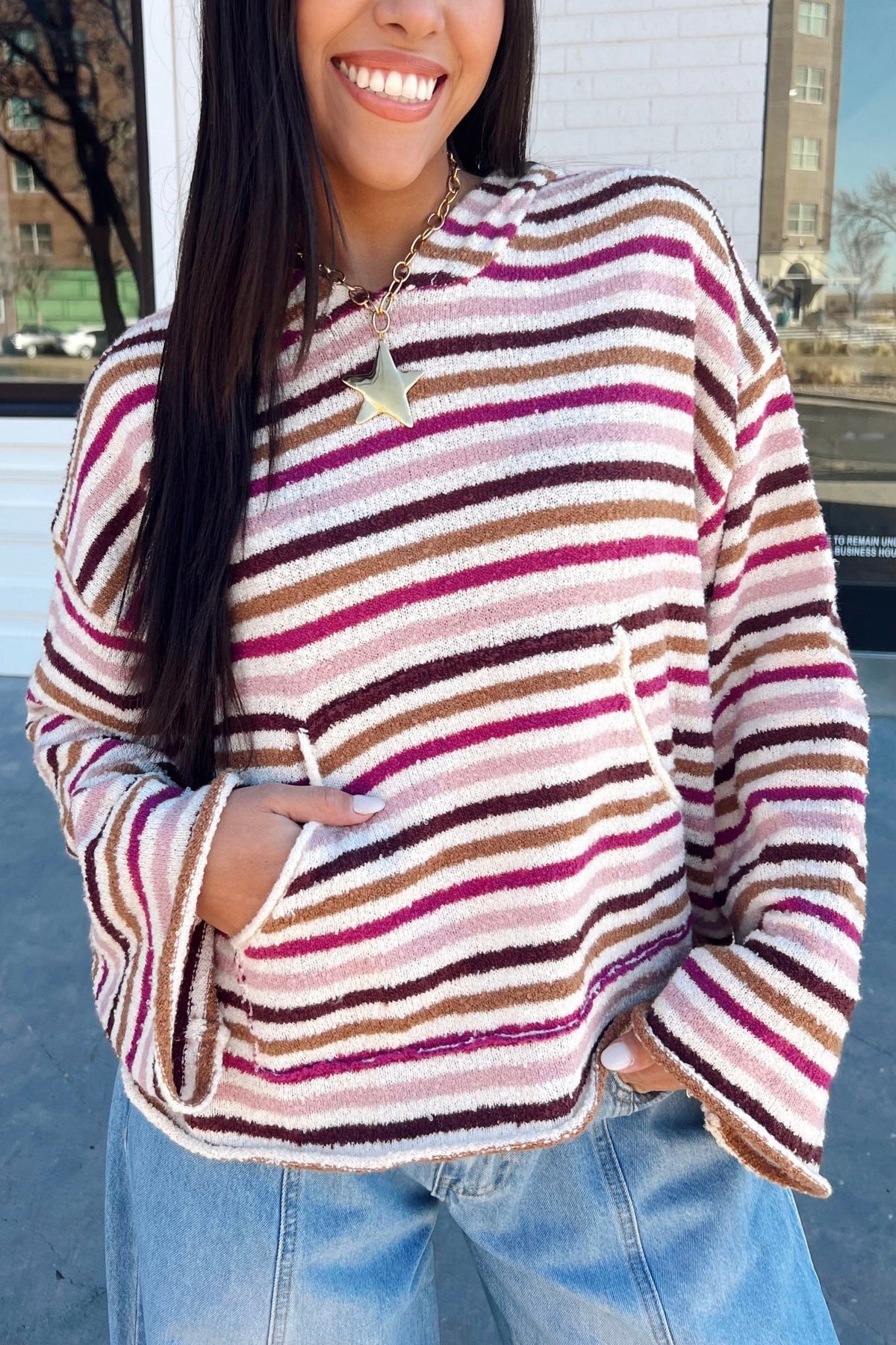 This striped hoodie is the laid back layer you’ll grab all season long. With soft mocha, cream, berry, and pink tones, plus a relaxed fit and a front pocket for cozy hands, it’s perfect for errands, travel days, and everything in between.