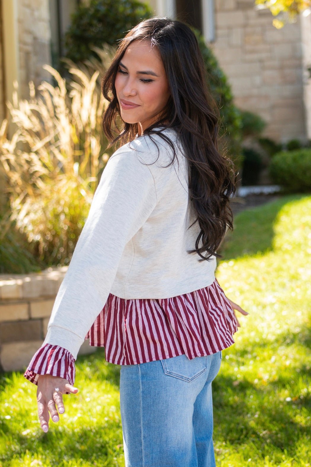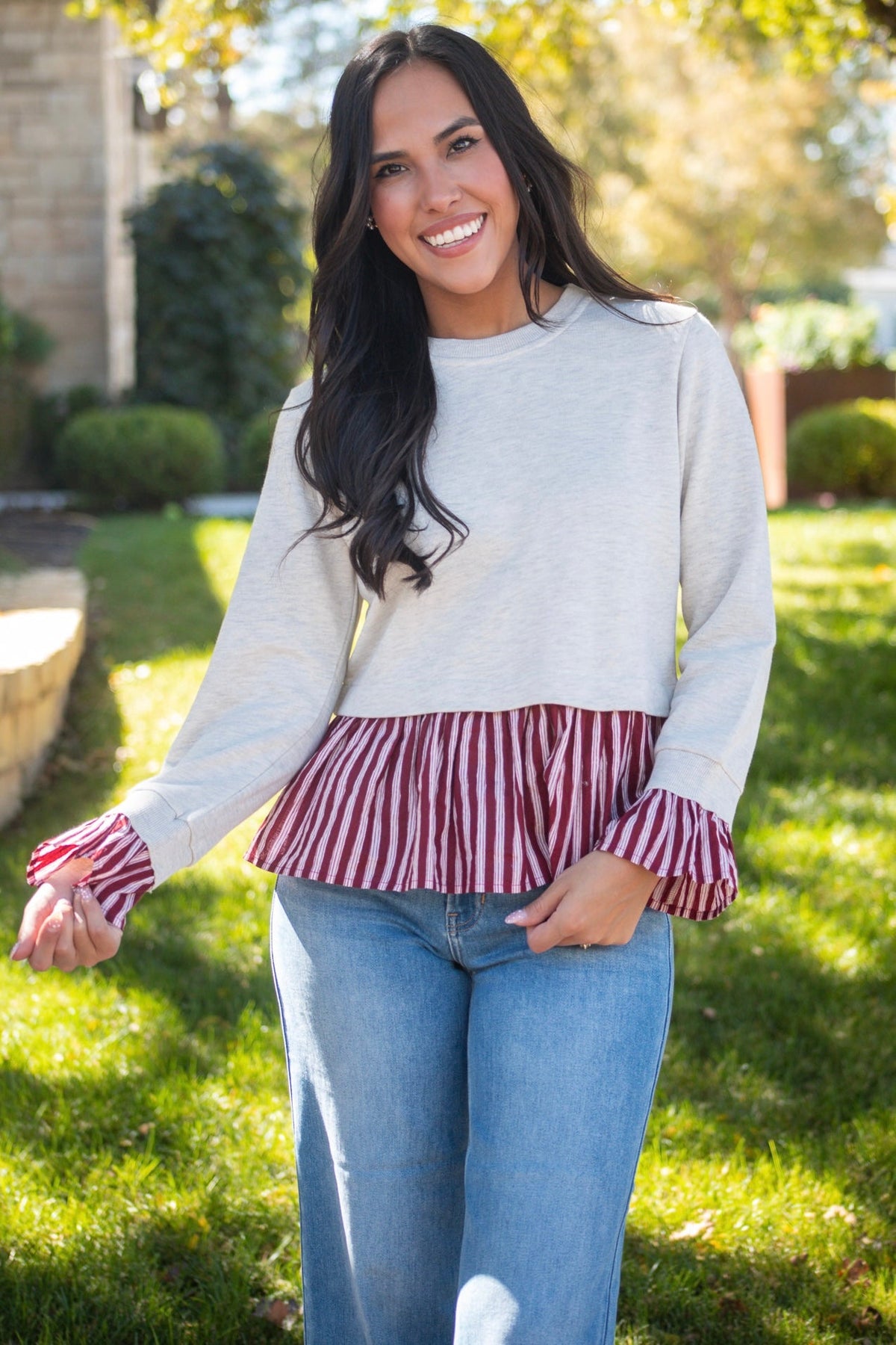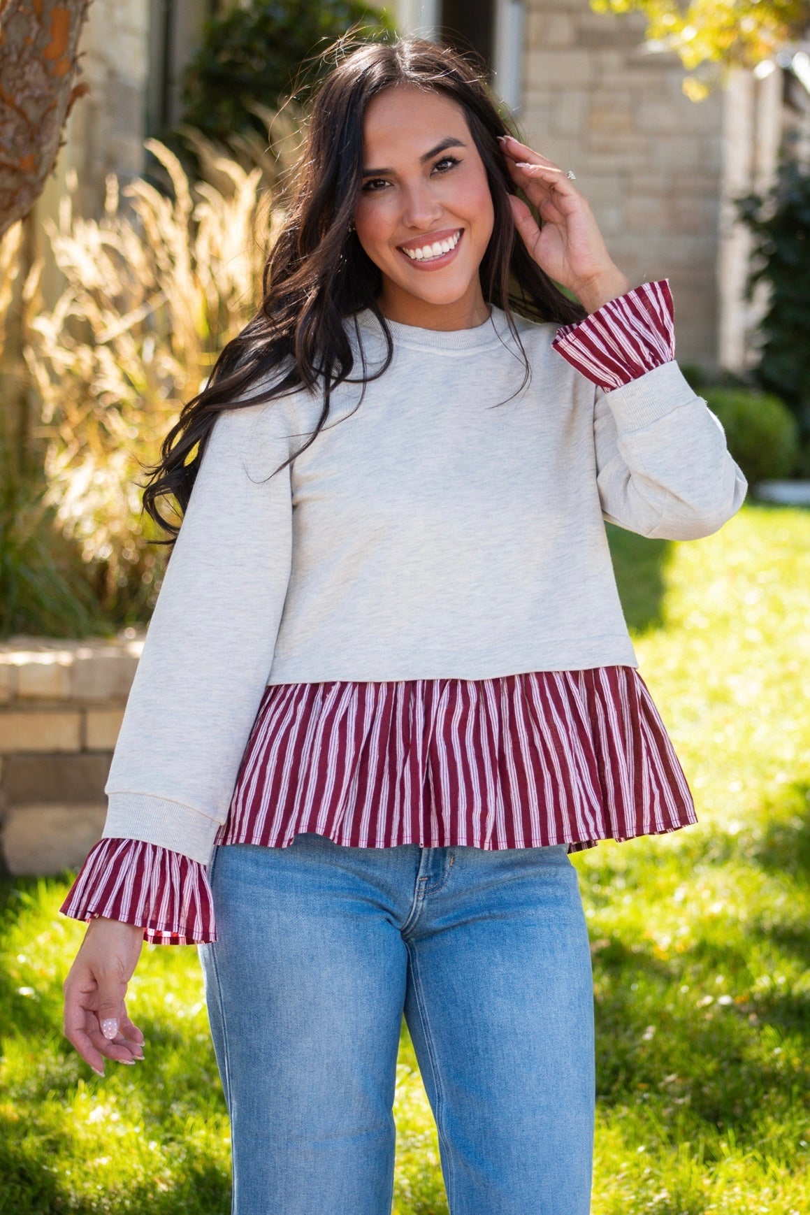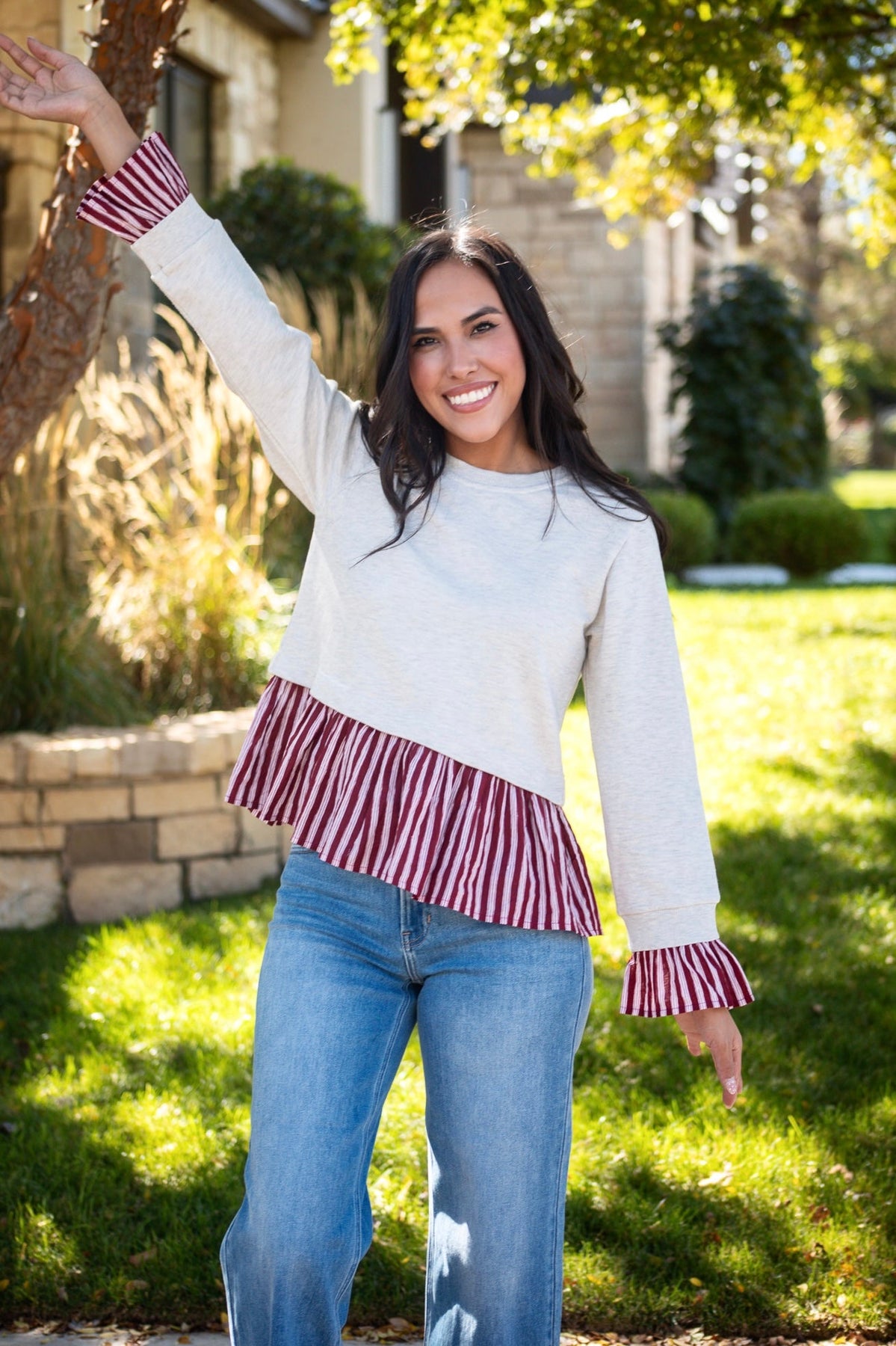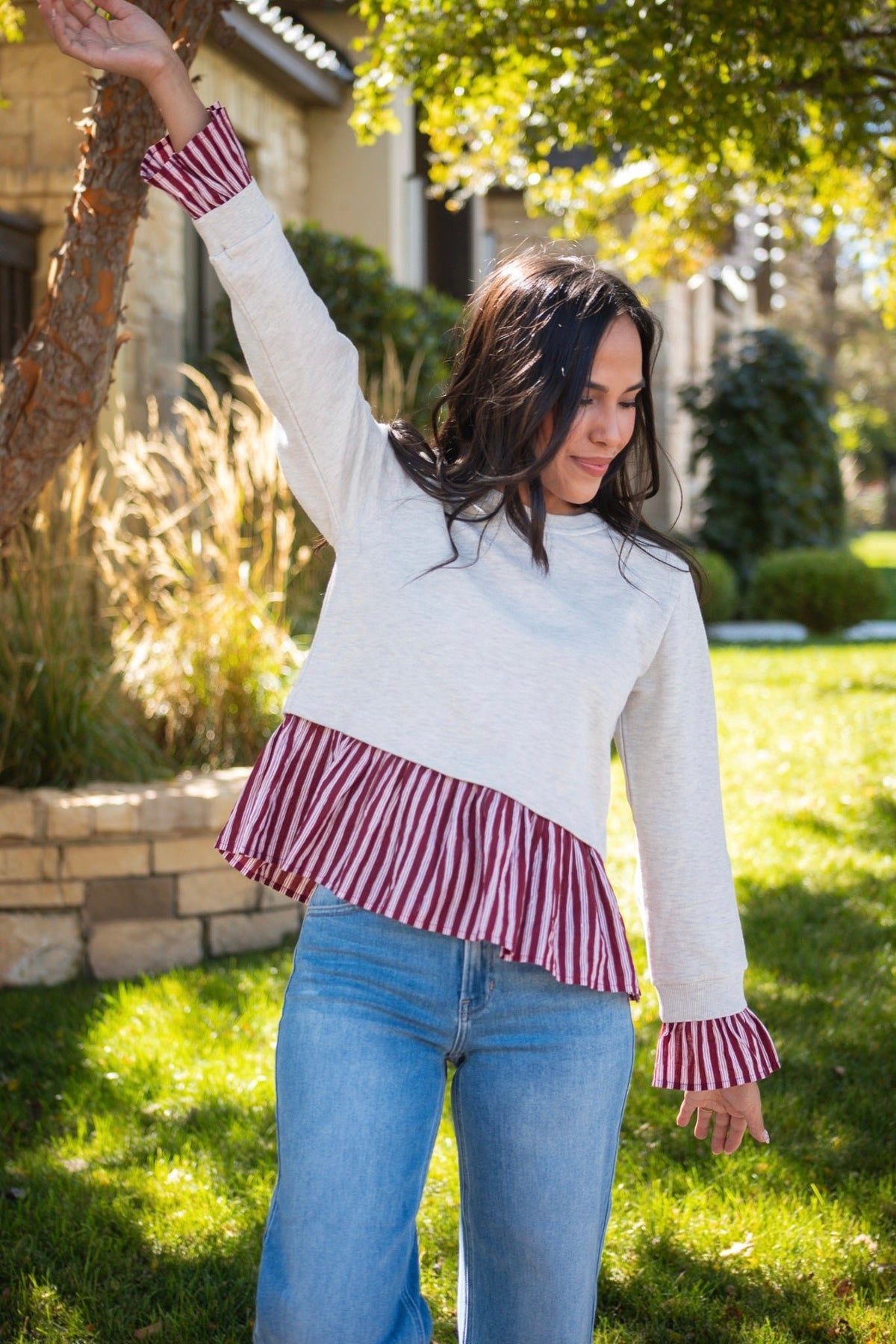 Cozy meets cute in this fall ready sweatshirt featuring a soft heathered body with cranberry striped ruffle trim at the sleeves and hem. The perfect mix of comfy and feminine. Pair it with denim and booties for a casual day out or leggings for a cozy weekend look.